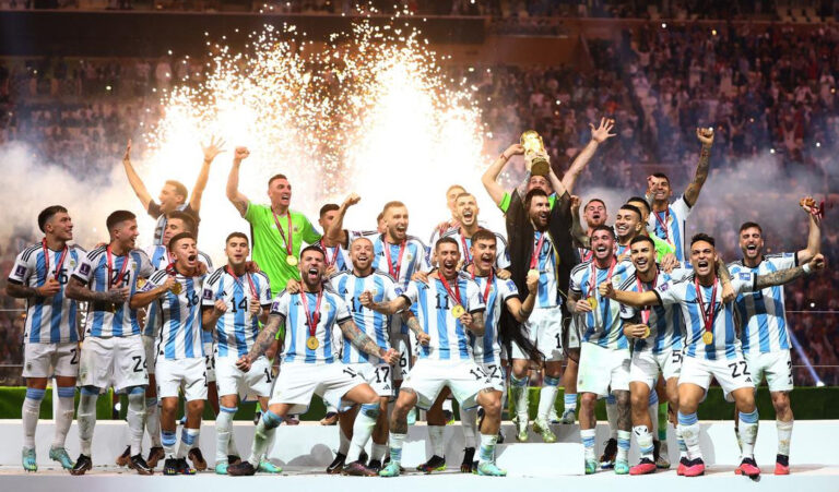ਫੀਫਾ ਵਰਲਡ ਕੱਪ ਦੇ ਫਾਈਨਲ ਮੈਚ ‘ਚ ਅਰਜਨਟੀਨਾ ਨੇ ਫਰਾਂਸ ਨੂੰ ਪੈਨਲਟੀ ਸ਼ੂਟਆਊਟ ‘ਚ 4-2 ਨਾਲ ਹਰਾ ਕੇ ਟਰਾਫੀ ਉਤੇ ਕਬਜ਼ਾ ਕਰ ਲਿਆ। ਫੀਫਾ ਵਰਲਡ ਕੱਪ ਦੀ ਜੇਤੂ ਟੀਮ ਨੂੰ 42 ਮਿਲੀਅਨ ਡਾਲਰ ਦੀ ਇਨਾਮੀ ਰਾਸ਼ੀ ਦਿੱਤੀ ਜਾਵੇਗੀ ਤੇ ਹਾਰਨ ਵਾਲੀ ਟੀਮ ਨੂੰ 30 ਮਿਲੀਅਨ ਡਾਲਰ ਦਾ ਇਨਾਮ ਦਿੱਤਾ ਜਾਵੇਗਾ। ਅਰਜਨਟੀਨਾ ਨੇ 36 ਸਾਲ ਬਾਅਦ ਤੀਜੀ ਵਾਰ ਵਰਲਡ ਕੱਪ ਖ਼ਿਤਾਬ ਉਤੇ ਕਬਜ਼ਾ ਕੀਤਾ ਹੈ। ਇਸ ਤੋਂ ਪਹਿਲਾਂ 1978 ਤੇ 1986 ‘ਚ ਟੀਮ ਨੇ ਵਰਲਡ ਕੱਪ ਜਿੱਤਿਆ ਸੀ। ਦੋ-ਦੋ ਗੋਲਾਂ ਨਾਲ ਮੁਕਾਬਲਾ ਬਰਾਬਰ ਰਹਿਣ ਉਤੇ ਕਈ ਵਾਰ ਵਾਧੂ ਸਮਾਂ ਦਿੱਤਾ ਗਿਆ। ਇਸੇ ਦੌਰਾਨ ਅਰਜਨਟੀਨਾ ਵੱਲੋਂ ਲਿਓਨਲ ਮੈਸੀ ਨੇ ਗੋਲ ਕਰ ਕੇ ਆਪਣੀ ਟੀਮ ਨੂੰ 3-2 ਨਾਲ ਅੱਗੇ ਕਰ ਦਿੱਤਾ। ਹਾਲਾਂਕਿ ਕਾਇਲੀਅਨ ਐਮਬਾਪੇ ਨੇ ਮੈਚ ਦਾ ਆਪਣਾ ਤੀਜਾ ਗੋਲ ਕਰਦਿਆਂ ਫਰਾਂਸ ਨੂੰ ਬਰਾਬਰੀ ਉਤੇ ਲਿਆ ਖੜ੍ਹਾ ਕੀਤਾ। ਮੁਕਾਬਲਾ ਤਿੰਨ-ਤਿੰਨ ਨਾਲ ਬਰਾਬਰ ਹੋਣ ਅਤੇ ਵਾਧੂ ਸਮਾਂ ਦੇਣ ਤੋਂ ਬਾਅਦ ਪੈਨਲਟੀ ਸ਼ੂਟਆਊਟ ਦਾ ਫੈਸਲਾ ਲਿਆ ਗਿਆ ਜਿਸ ‘ਚ ਫਰਾਂਸ ਦੋ ਗੋਲ ਕਰਨ ਤੋਂ ਖੁੰਝ ਗਿਆ। ਇਸ ਤੋਂ ਪਹਿਲਾਂ ਅਰਜਨਟੀਨਾ ਵੱਲੋਂ ਸਟਾਰ ਫੁਟਬਾਲਰ ਲਿਓਨਲ ਮੈਸੀ ਤੇ ਏਂਜਲ ਡੀ ਮਾਰੀਆ ਨੇ ਪਹਿਲੇ ਅੱਧ ‘ਚ ਹੀ ਇਕ-ਇਕ ਗੋਲ ਕਰ ਕੇ ਆਪਣੀ ਟੀਮ ਨੂੰ ਦੋ ਗੋਲਾਂ ਨਾਲ ਅੱਗੇ ਕਰ ਦਿੱਤਾ। ਦੱਸਣਯੋਗ ਹੈ ਕਿ ਇਸ ਤੋਂ ਪਹਿਲਾਂ ਮੈਸੀ ਨੇ 23ਵੇਂ ਮਿੰਟ ‘ਚ ਪੈਨਲਟੀ ਕਿੱਕ ਰਾਹੀਂ ਟੂਰਨਾਮੈਂਟ ਦਾ ਆਪਣਾ ਛੇਵਾਂ ਗੋਲ ਕੀਤਾ ਤੇ ਅਰਜਨਟੀਨਾ ਨੂੰ 1-0 ਨਾਲ ਅੱਗੇ ਕਰ ਦਿੱਤਾ। ਇਸ ਤਰ੍ਹਾਂ ਉਸ ਨੇ ਬ੍ਰਾਜ਼ੀਲ ਦੇ ਮਹਾਨ ਖਿਡਾਰੀ ਪੇਲੇ ਦੇ ਰਿਕਾਰਡ ਦੀ ਬਰਾਬਰੀ ਕਰ ਲਈ ਜਦਕਿ ਏਂਜਲ ਡੀ ਮਾਰੀਆ ਨੇ 36ਵੇਂ ਮਿੰਟ ‘ਿਚ ਗੋਲ ਕਰ ਕੇ ਅਰਜਨਟੀਨਾ ਨੂੰ 2-0 ਦੀ ਲੀਡ ਦਿਵਾ ਦਿੱਤੀ। ਪਰ ਫਰਾਂਸ ਦੇ ਸਟਾਰ ਖਿਡਾਰੀ ਕਾਇਲੀਅਨ ਐਮਬਾਪੇ ਨੇ 97 ਸਕਿੰਟਾਂ ਦੇ ਫ਼ਰਕ ਨਾਲ ਦੋ ਗੋਲ ਕਰ ਕੇ ਮੈਚ ਹੀ ਪਲਟ ਦਿੱਤਾ ਤੇ ਆਪਣੀ ਟੀਮ ਨੂੰ ਅਰਜਨਟੀਨਾ ਦੇ ਬਰਾਬਰ ਲਿਆ ਖੜ੍ਹਾ ਕੀਤਾ। ਐਮਬਾਪੇ ਨੇ ਪਹਿਲਾ ਗੋਲ ਪੈਨਲਟੀ ਰਾਹੀਂ 80ਵੇਂ ਮਿੰਟ ‘ਚ ਕੀਤਾ ਜਦਕਿ ਦੂਜਾ ਗੋਲ 81ਵੇਂ ਮਿੰਟ ‘ਚ ਹੀ ਕਰ ਦਿੱਤਾ। ਐਮਬਾਪੇ ਨੇ ਪੈਨਲਟੀ ਸ਼ੂਟਆਊਟ ‘ਚ ਵੀ ਗੋਲ ਕੀਤਾ। ਇਸ ਤਰ੍ਹਾਂ ਐਮਬਾਪੇ ਵਰਲਡ ਕੱਪ ਫਾਈਨਲ ‘ਚ ਹੈਟਟ੍ਰਿਕ ਕਰਨ ਵਾਲਾ ਦੂਜਾ ਖਿਡਾਰੀ ਬਣ ਗਿਆ ਹੈ। ਅਰਜਨਟੀਨਾ ਨੇ ਮੈਚ ਦੀ ਸ਼ੁਰੂਆਤ ‘ਚ ਹੀ ਸਕਾਰਾਤਮਕ ਰੁਖ਼ ਅਪਣਾਇਆ ਤੇ ਲਗਾਤਾਰ ਹੱਲੇ ਬੋਲੇ। ਇਸੇ ਦੌਰਾਨ ਜੂਲੀਅਨ ਅਲਵਾਰੇਜ਼ ਨੂੰ ਵੀ ਚੰਗਾ ਮੌਕਾ ਮਿਲਿਆ ਜਿਸ ਦਾ ਹਾਲਾਂਕਿ ਉਹ ਲਾਹਾ ਨਹੀਂ ਲੈ ਸਕਿਆ। ਮੈਕ ਐਲਿਸਟਰ ਨੇ ਵੀ ਸ਼ੂਟ ਲਾ ਕੇ ਮੌਕਾ ਬਣਾਉਣ ਦੀ ਕੋਸ਼ਿਸ਼ ਕੀਤੀ ਪਰ ਬਾਲ ਸਿੱਧੀ ਫਰਾਂਸ ਦੇ ਗੋਲਕੀਪਰ ਹਿਊਗੋ ਲੌਰਿਸ ਦੇ ਹੱਥਾਂ ‘ਚ ਗਈ। ਮੈਚ ਦੇ 14ਵੇਂ ਮਿੰਟ ‘ਚ ਹੀ ਕਾਇਲੀਅਨ ਐਮਬਾਪੇ ਨੇ ਵੀ ਫਰਾਂਸ ਲਈ ਗੋਲ ਦਾ ਮੌਕਾ ਬਣਾਉਣ ਦੀ ਕੋਸ਼ਿਸ਼ ਕੀਤੀ ਪਰ ਉਸ ਦੇ ਹੱਥ ਨਿਰਾਸ਼ਾ ਹੀ ਲੱਗੀ। ਕਤਰ ਵਰਲਡ ਕੱਪ ‘ਚ ਇਹ ਛੇਵੀਂ ਵਾਰ ਹੈ ਜਦ ਅਰਜਨਟੀਨਾ ਨੇ 2-0 ਦੀ ਲੀਡ ਬਣਾਈ ਹੈ। ਫਰਾਂਸ ਦੇ ਰਾਸ਼ਟਰਪਤੀ ਇਮੈਨੁਅਲ ਮੈਕਰੋਂ ਵੀ ਇਸ ਮੌਕੇ ਮੈਦਾਨ ‘ਚ ਹਾਜ਼ਰ ਸਨ ਤੇ ਜੋਸ਼ ਨਾਲ ਆਪਣੀ ਟੀਮ ਦਾ ਹੌਸਲਾ ਵਧਾਇਆ।